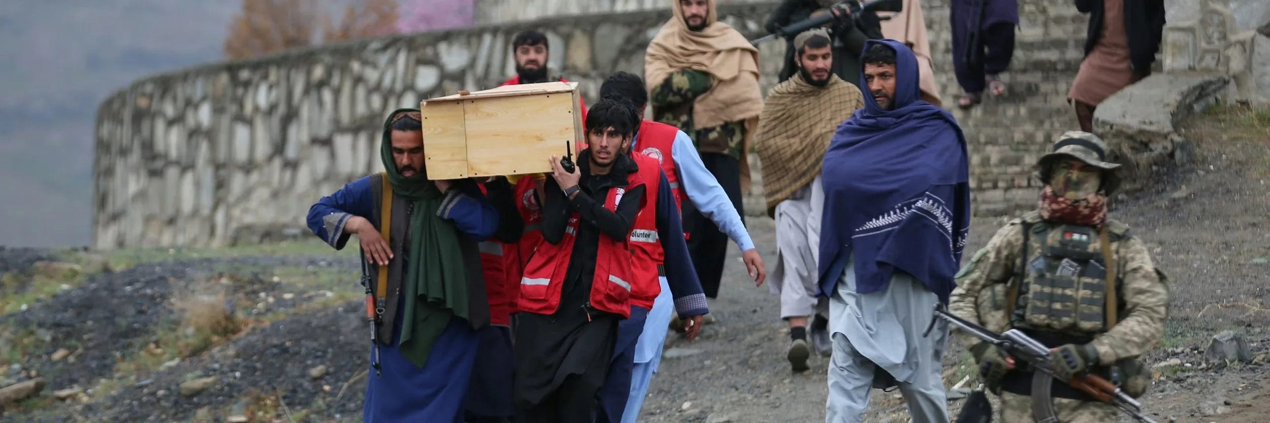 Taliban security personnel guard people carrying the remains of victims of the Pakistani strike on a drug rehabilitation hospital, ahead of burial in Kabul, Afghanistan, on March 18, 2026. (AP Photo/Siddiqullah Alizai)